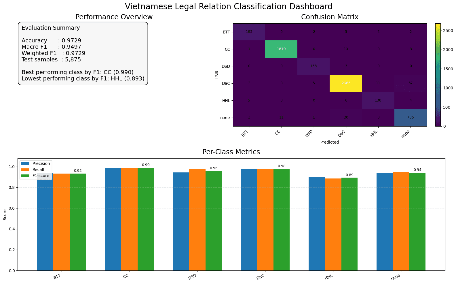 Figure 1 & 2: Model performance summary, confusion matrix across legal relation labels, and per-class precision, recall, and F1.
